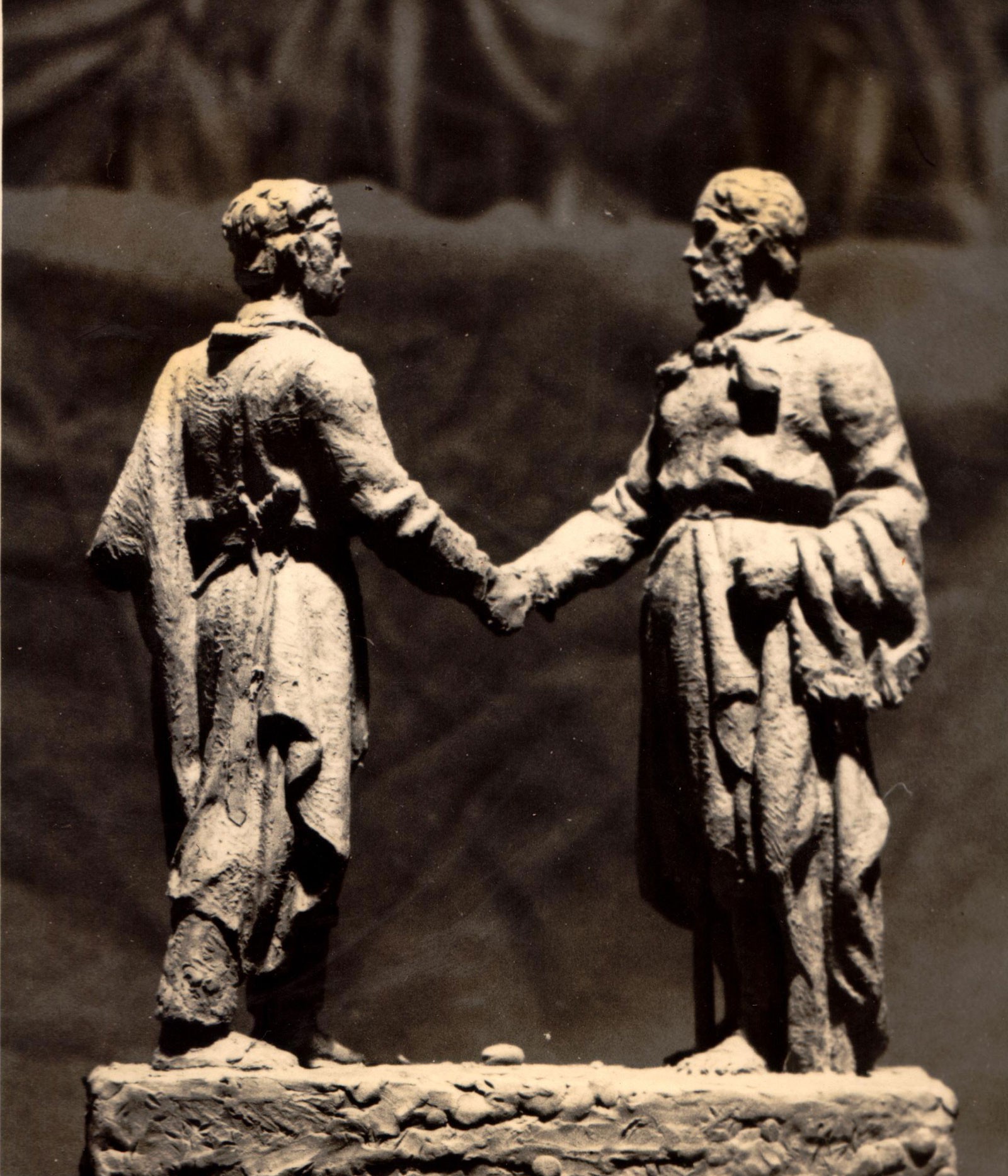 Figura sedente de Ansina. Viste clásico poncho patrio y botas de potro. Empuña en la diestra lanza de tacuara. Detrás del basamento, pantalla de granito gris. Grabada, copia del retrato de Artigas en la Ciudadela, de Juan Manuel Blanes. En el extremo superior izquierdo de la pantalla, la leyenda: "Manuel A. Ledesma - Ansina". En el inferior derecho, "Juntos en el exilio - Juntos en la eternidad - Juntos en su patria para gloria de un pueblo agradecido".Manuel A. Ledesma, apodado "Ansina", acompañó fielmente a Artigas durante su exilio en el Paraguay, adonde lo siguió en 1820. Fallecido Artigas en 1850, se trasladó al pueblo Guarambaré, donde murió en 1887. Sus restos fueron repatriados en 1938 y depositados en el Panteón Nacional..